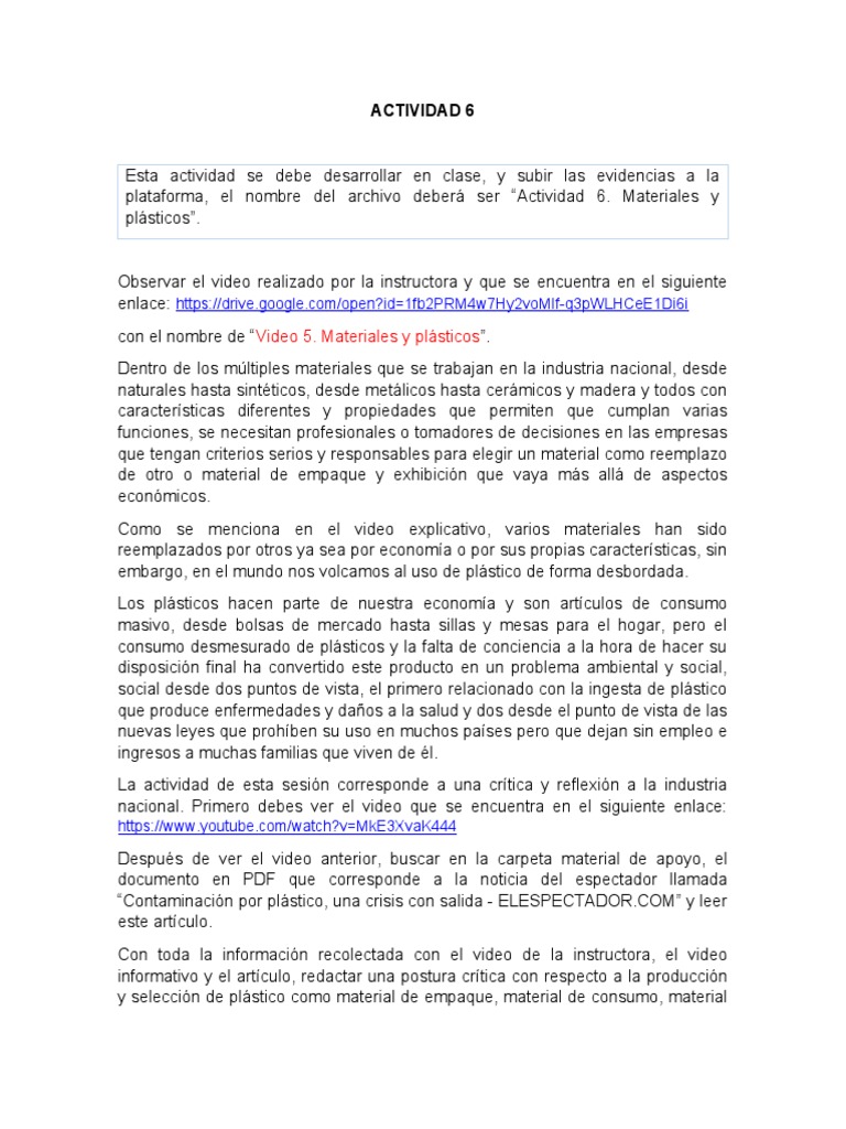 plataforma, el nombre del archivo deberá ser “Actividad 6. Materiales y