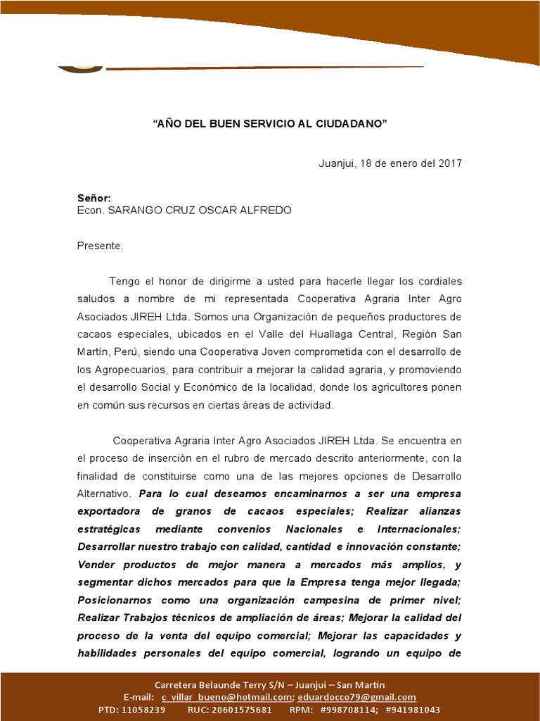saludos a nombre de mi representada Cooperativa Agraria Inter Agro