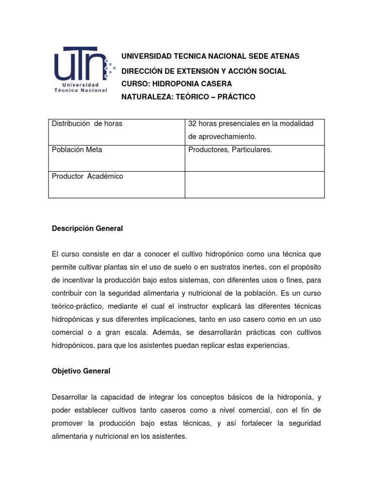 El curso consiste en dar a conocer el cultivo hidropónico como una técnica que