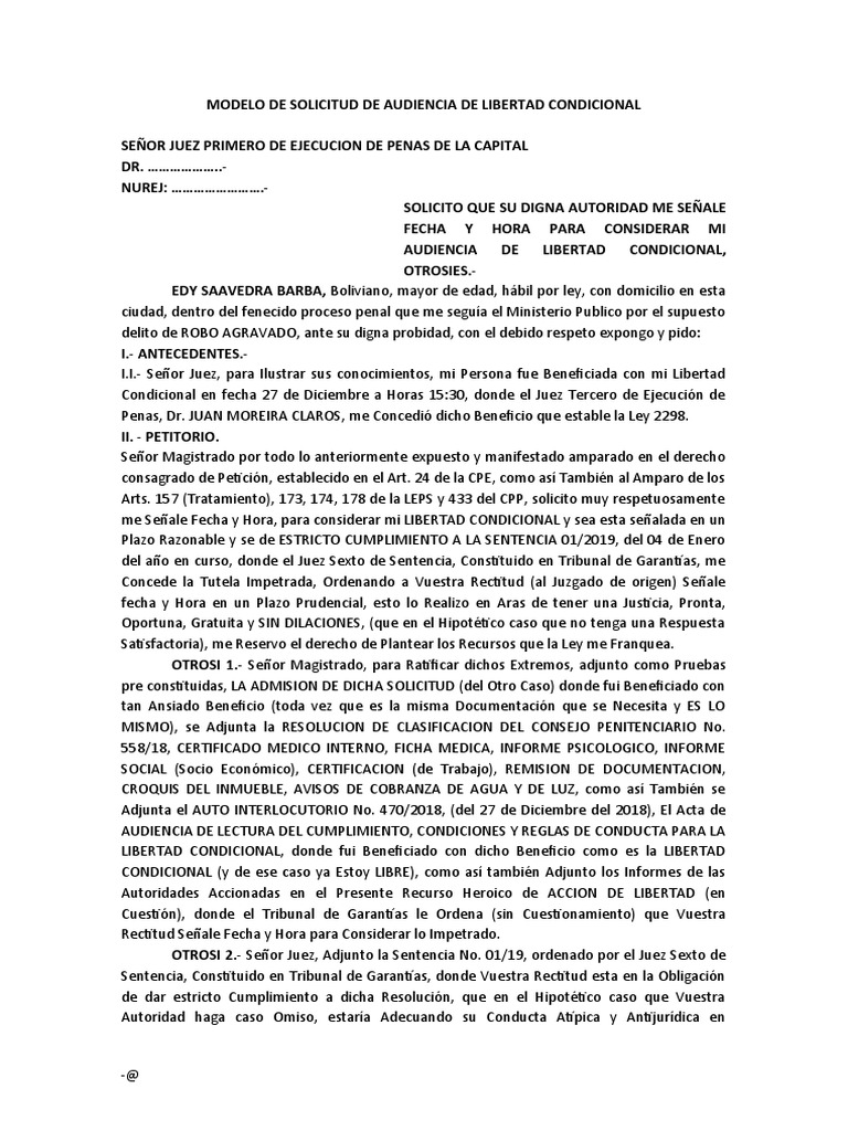 MODELO DE SOLICITUD DE AUDIENCIA DE LIBERTAD CONDICIONAL