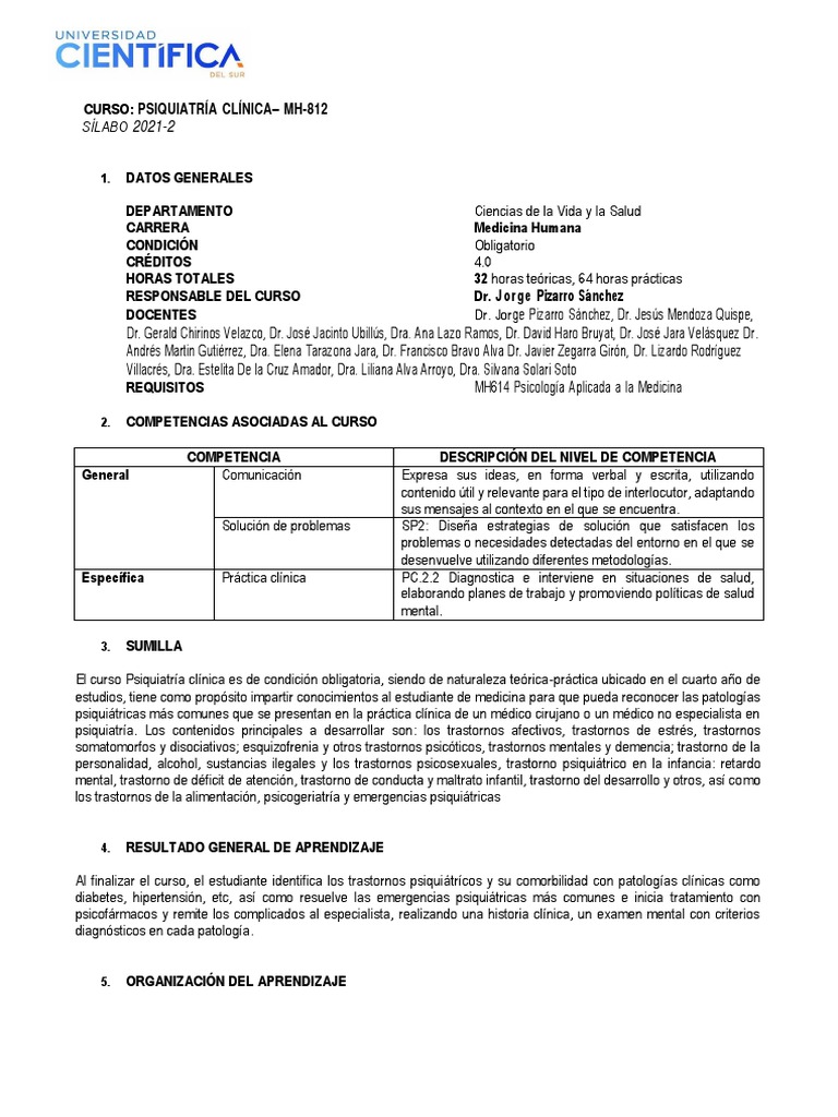 El curso Psiquiatría clínica es de condición obligatoria, siendo de naturaleza teórica-práctica ubicado en el cuarto año de