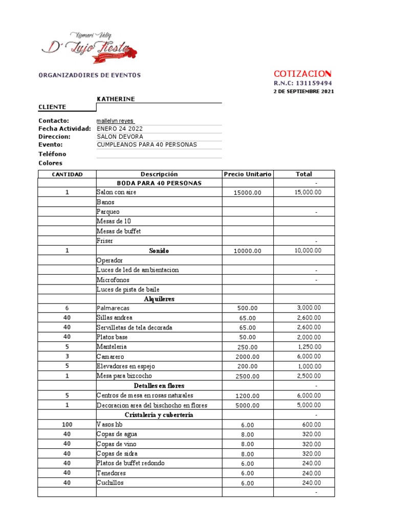 ORGANIZADOIRES DE EVENTOS COTIZACION