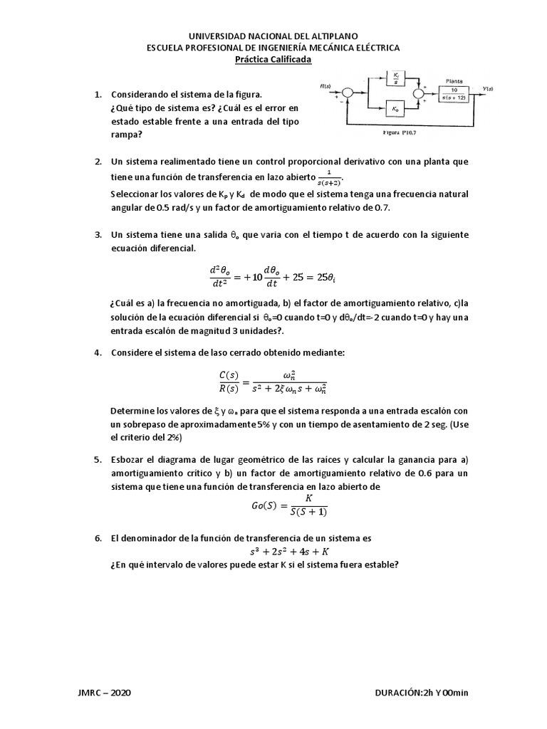 2. Un sistema realimentado tiene un control proporcional derivativo con una planta que