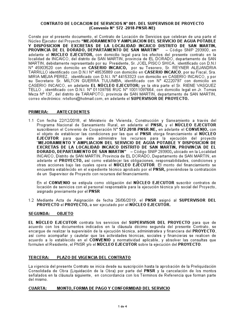 CASERIO INCAICO, en adelante EL NÚCLEO EJECUTOR; ye la otra parte el Sr. RIENE VASQUEZ