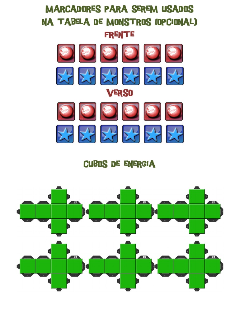 Este documento lista tres elementos: Marcadores para ser usados, Tabla de Monstros (Opcional) indicando Frente y Verso, y Cubos de Energía.