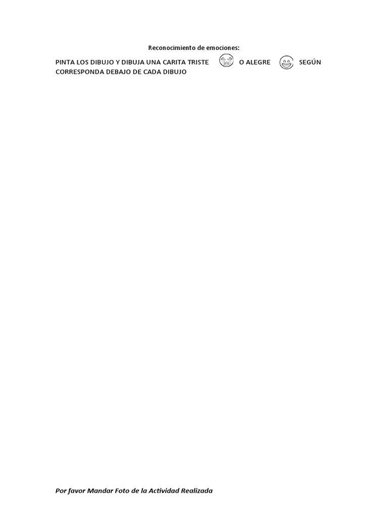 El documento solicita realizar dibujos y expresar emociones a través de caritas tristes o alegres. Se pide enviar una foto de la actividad realizada. La actividad está enfocada en el reconocimiento de emociones.