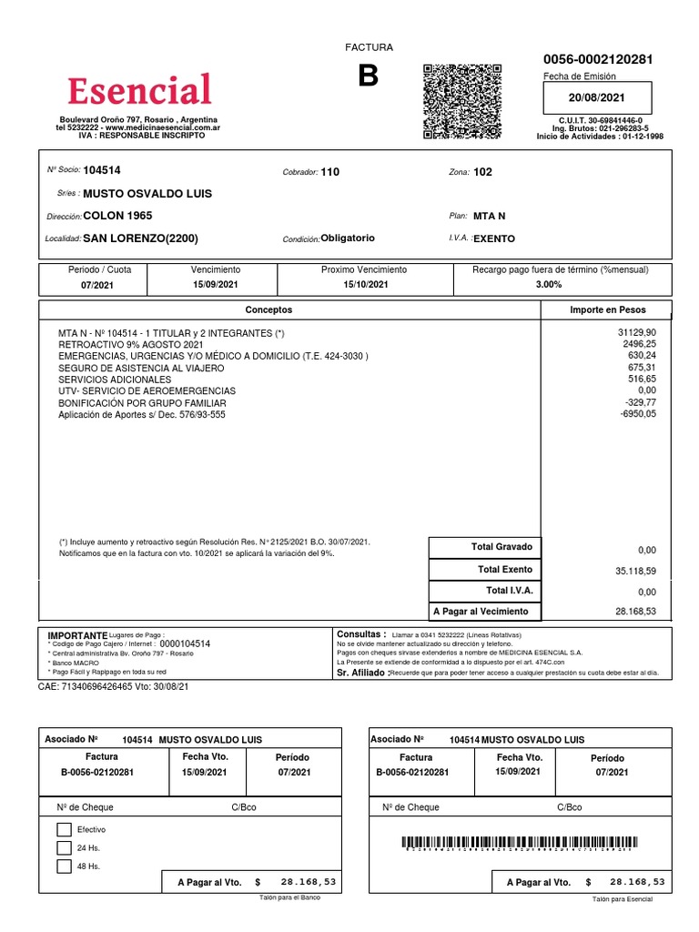 * Central administrativa Bv. Oroño 797 - Rosario Pagos con cheques sirvase extenderlos a nombre de MEDICINA ESENCIAL S.A.