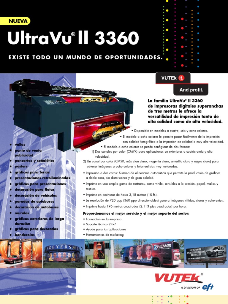 • gráficos para presentaciones • Imprime en una amplia gama de sustratos, como vinilo, sensibles a la presión, papel, mallas y
