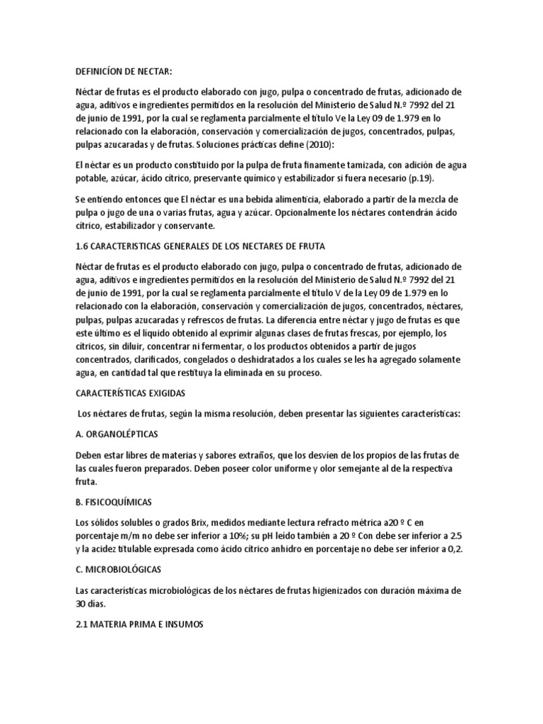 Los néctares de frutas, según la misma resolución, deben presentar las siguientes características: