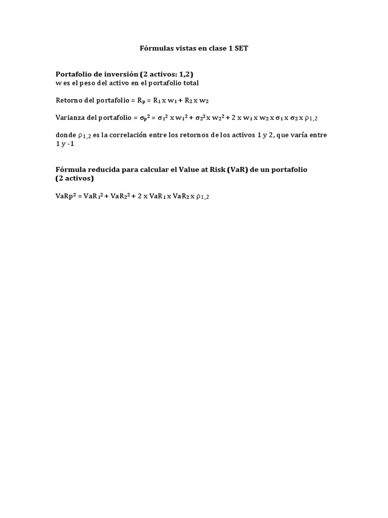 Varianza del portafolio = σp2 = σ12 x w12 + σ22 x w22 + 2 x w1 x w2 x σ1 x σ2 x ρ1,2
