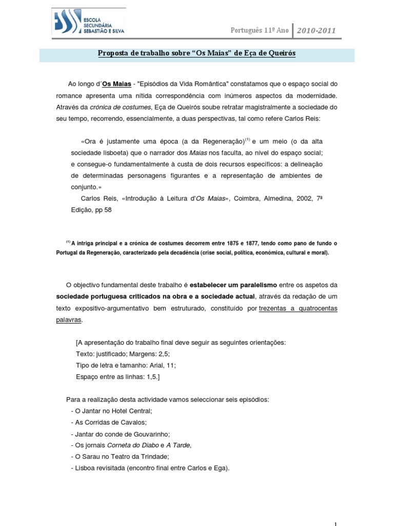 O objectivo fundamental deste trabalho é estabelecer um paralelismo entre os aspetos da sociedade portuguesa criticados na obra e a sociedade actual, através da redação de um texto expositivo-argumentativo bem estruturado, constituído por trezentas a quatrocentas palavras.