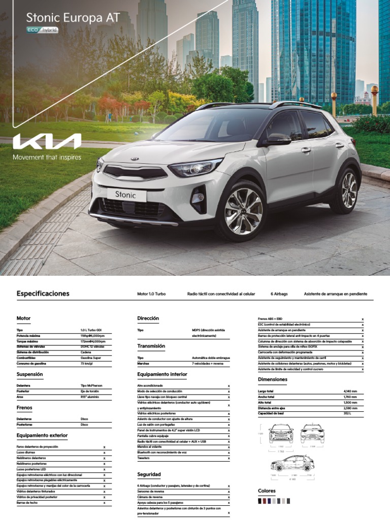Tipo 1.0 L Turbo GDI Tipo MDPS (dirección asistida Asistente de arranque en pendiente