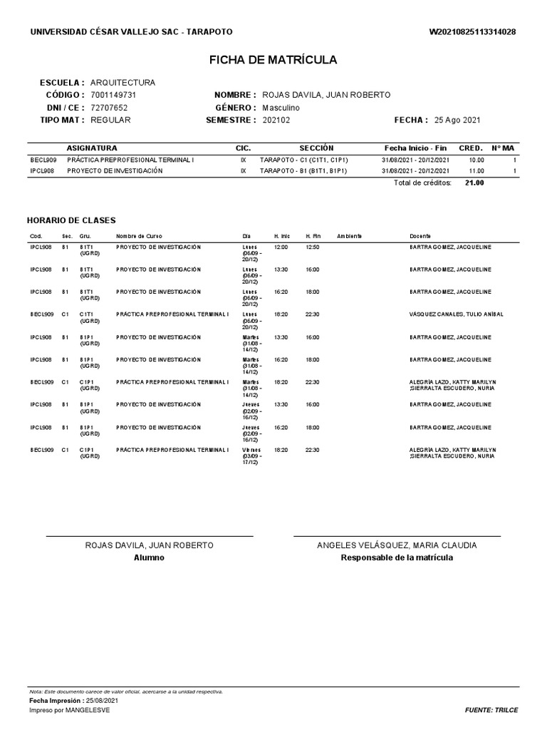 TIPO MAT : REGULAR SEMESTRE : 202102 FECHA : 25 Ago 2021