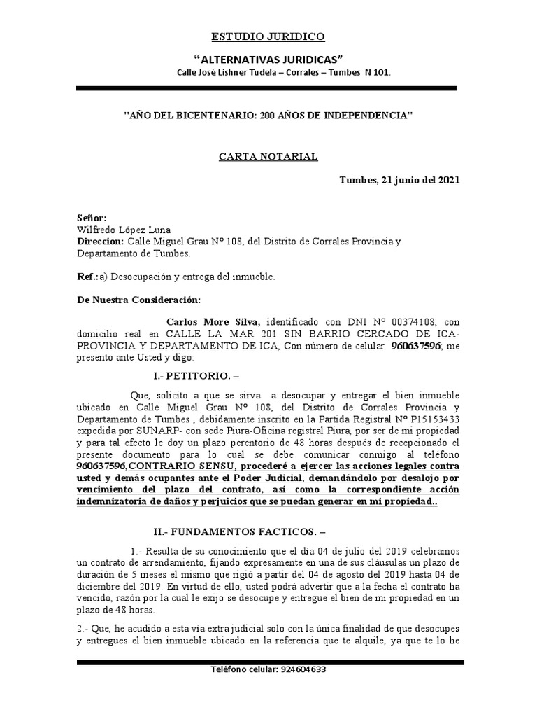 usted y demás ocupantes ante el Poder Judicial, demandándolo por desalojo por