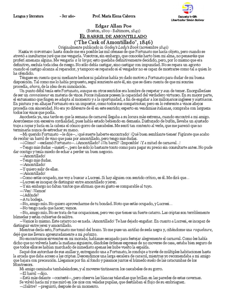 —No es nada —dijo Fortunato—. Sigamos adelante, pero bebamos antes otro trago de Medoc.