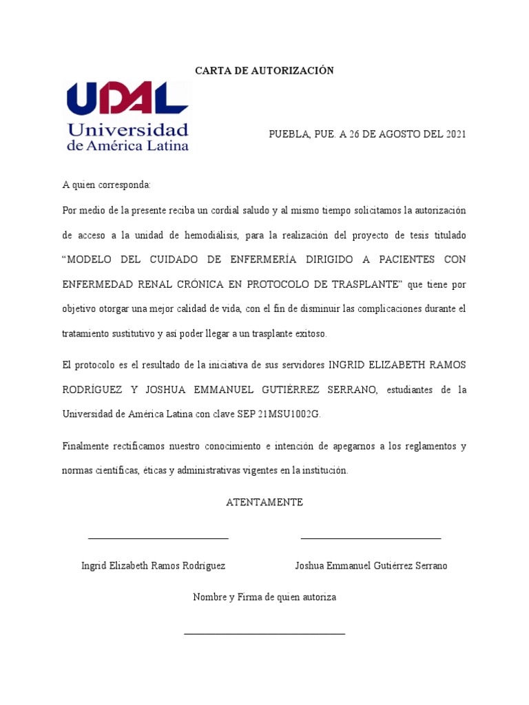 de acceso a la unidad de hemodiálisis, para la realización del proyecto de tesis titulado