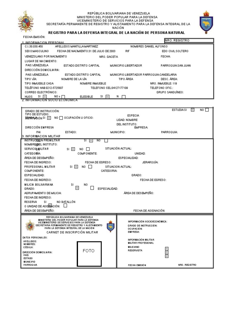 C.I.:30.030.450 APELLIDOS MANTILLA MARTINEZ NOMBRES DANIEL ALFONSO