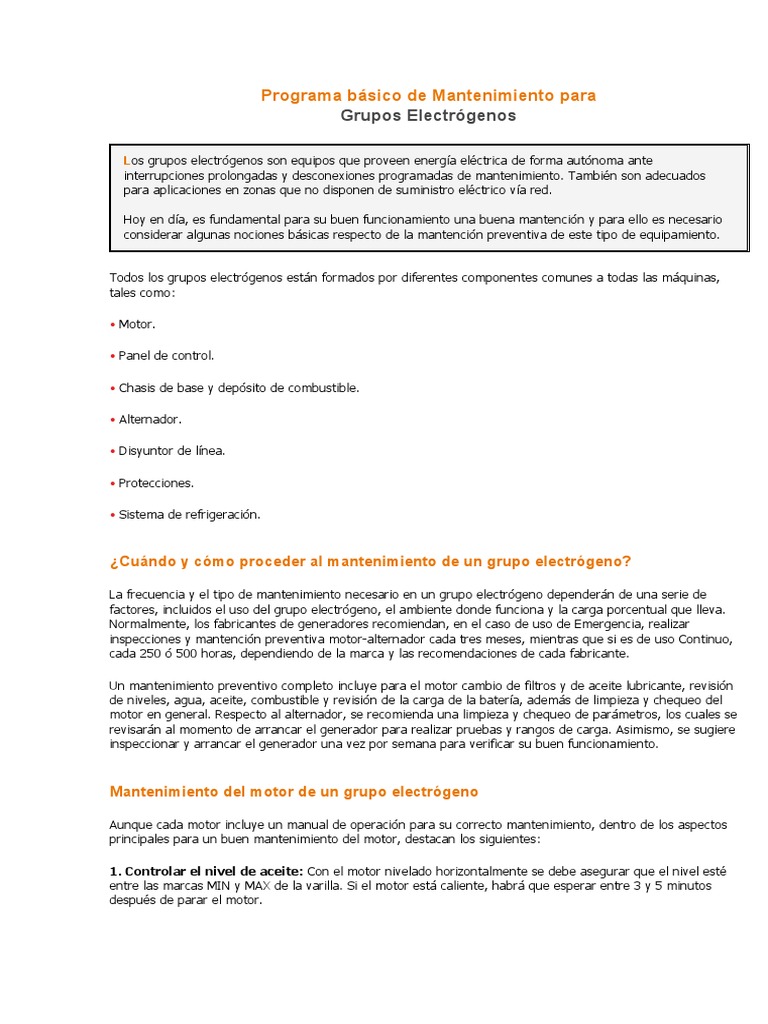 inspecciones y mantención preventiva motor-alternador cada tres meses, mientras que si es de uso Continuo,