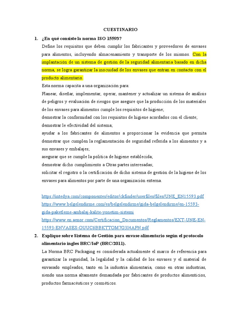 2. Explique sobre Sistema de Gestión para envase alimentario según el protocolo