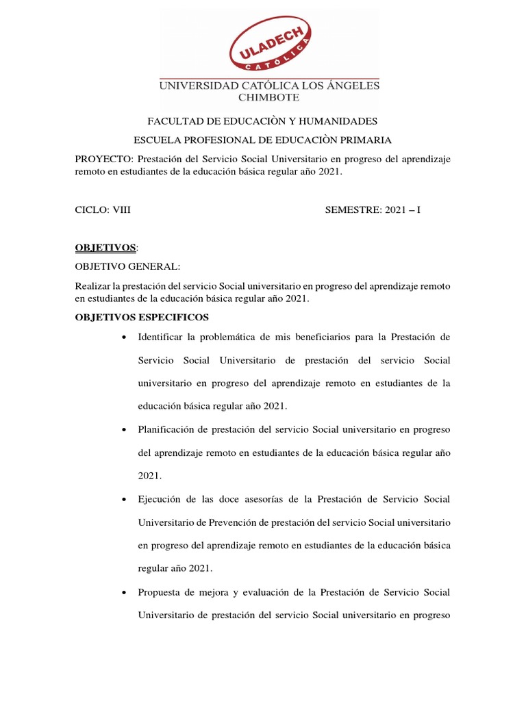 PROYECTO: Prestación del Servicio Social Universitario en progreso del aprendizaje