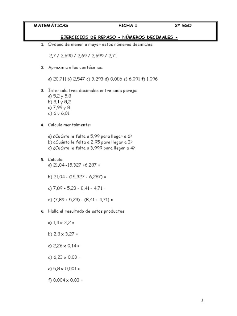 EJERCICIOS DE REPASO - NÚMEROS DECIMALES -