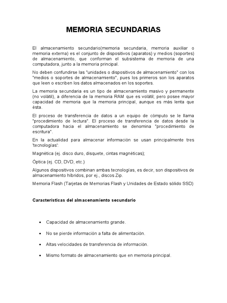La memoria secundaria es un tipo de almacenamiento masivo y permanente