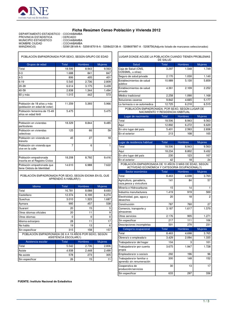 Ficha Resúmen Censo Población y Vivienda 2012