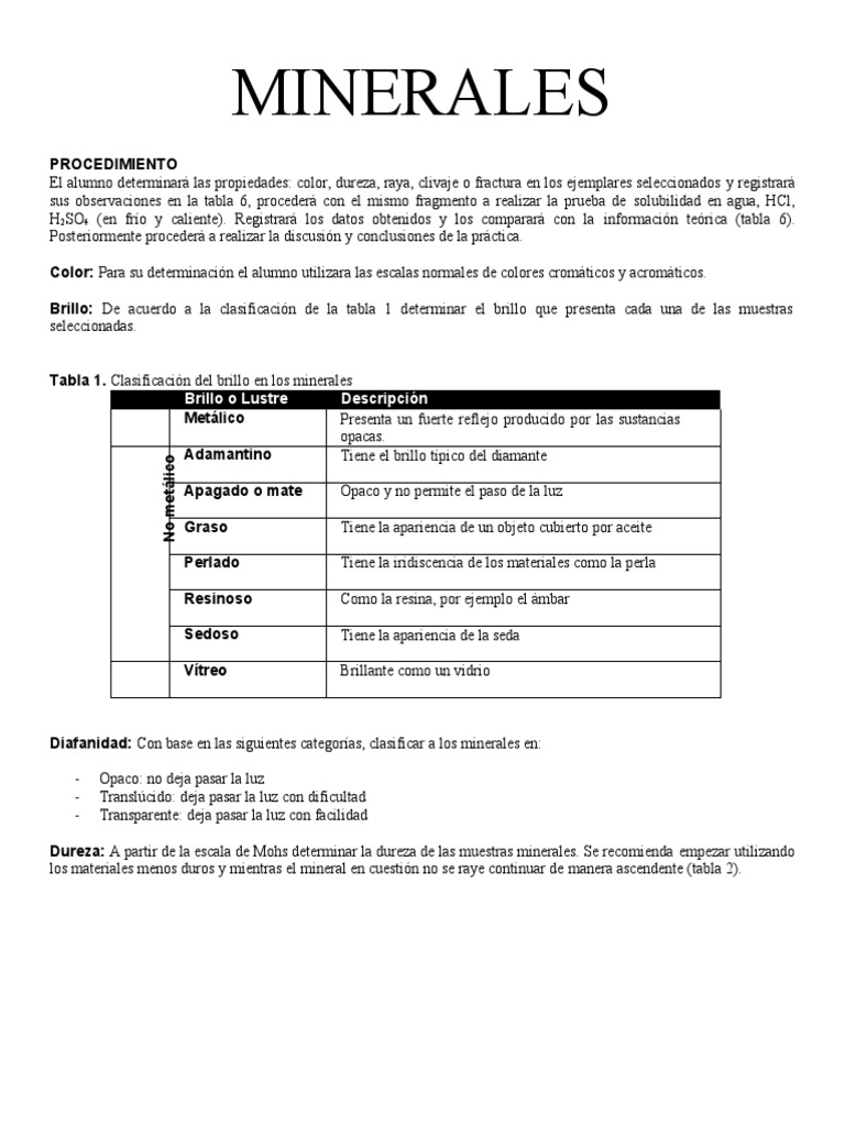 Tabla 1. Clasificación del brillo en los minerales