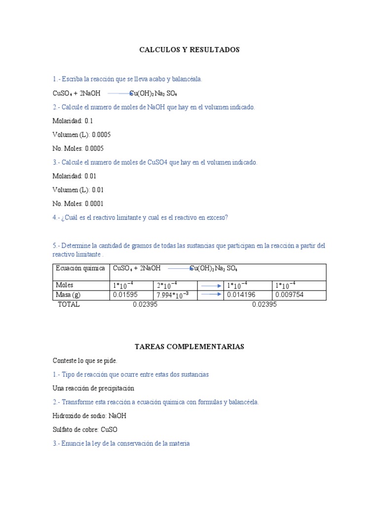 4.- ¿Cuál es el reactivo limitante y cual es el reactivo en exceso?