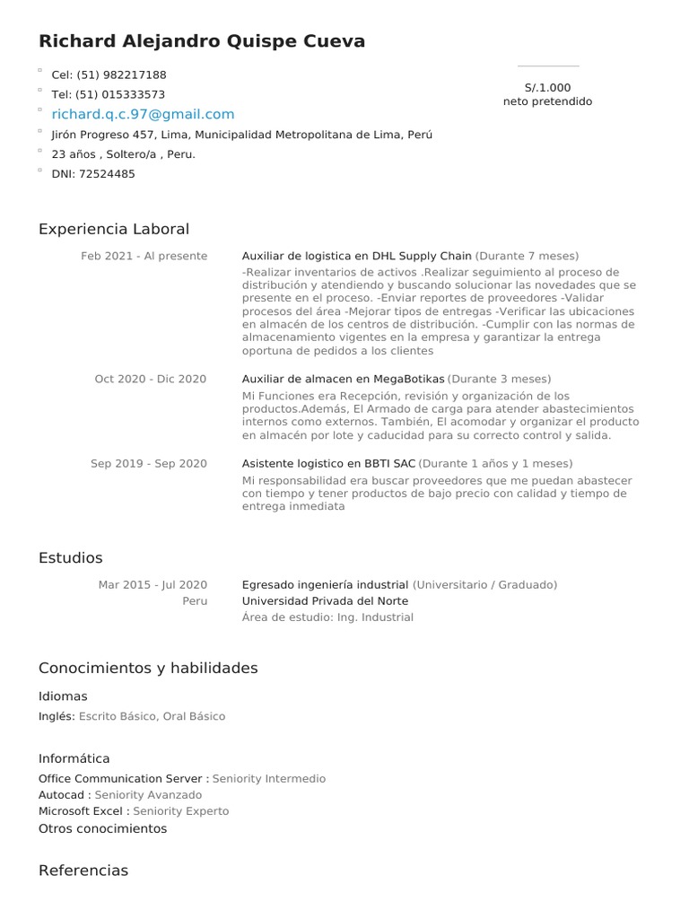 Feb 2021 - Al presente Auxiliar de logistica en DHL Supply Chain (Durante 7 meses)