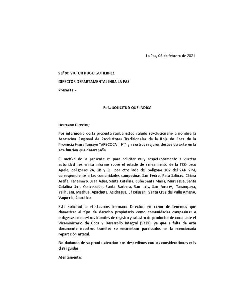 autoridad nos emita informe sobre el estado de saneamiento de la TCO Leco