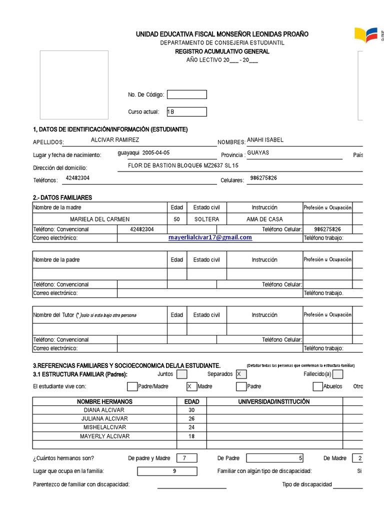 APELLIDOS: ALCIVAR RAMIREZ NOMBRES: ANAHI ISABEL