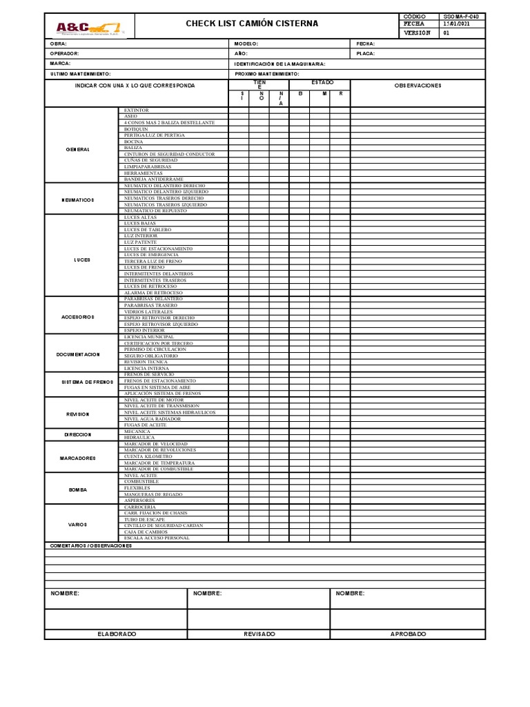 CHECK LIST CAMIÓN CISTERNA FECHA 15/01/2021