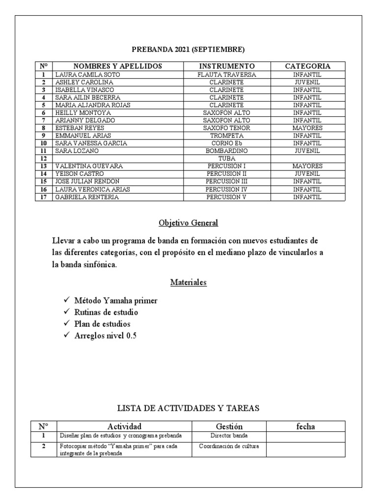 1 Diseñar plan de estudios y cronograma prebanda Director banda