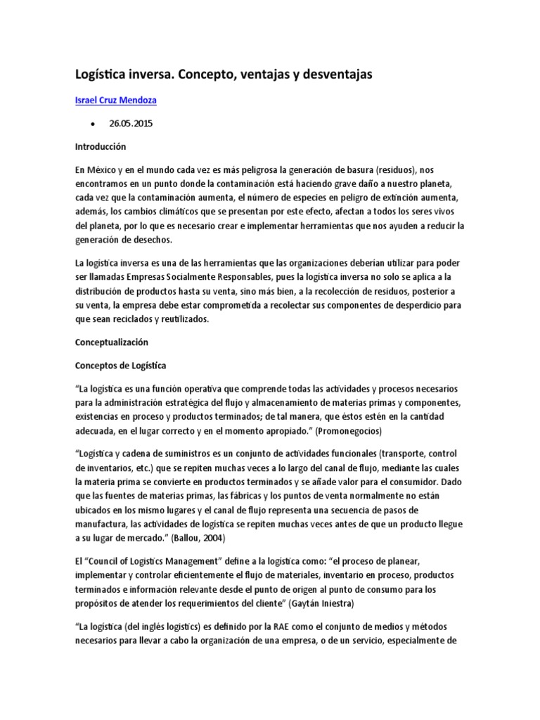 “La logística inversa, según el Consejo Ejecutivo de Logística Inversa, se puede definir como: el