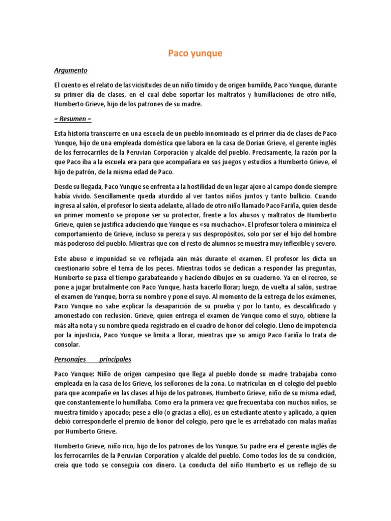 El cuento es el relato de las vicisitudes de un niño tímido y de origen humilde, Paco Yunque, durante