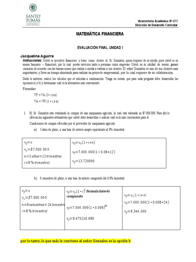 1. El Sr. Gonzalez está evaluando la compra de una maquinaria agrícola, la cual está valorada en $7.000.000. Para ello le