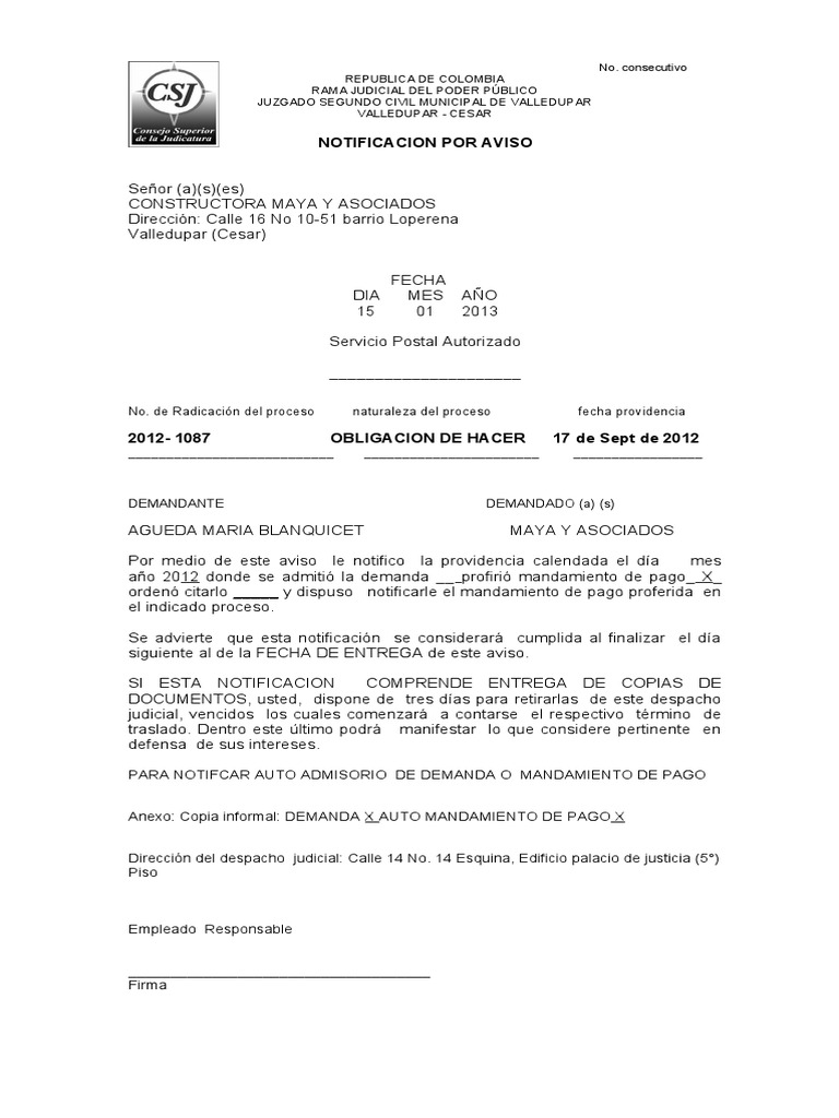 Por medio de este aviso le notifico la providencia calendada el día mes