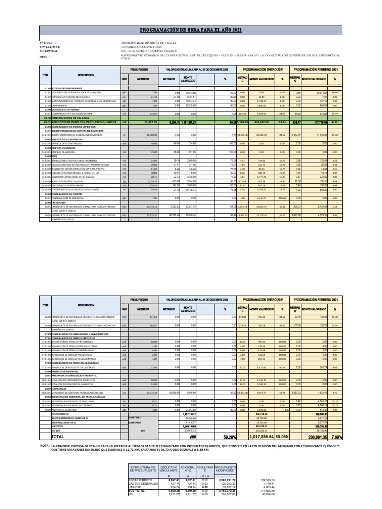 PRESUPUESTO VALORIZACIÓN ACUMULADA AL 31 DE DICIEMBRE 2020 PROGRAMACIÓN ENERO 2021 PROGRAMACIÓN FEBRERO 2021