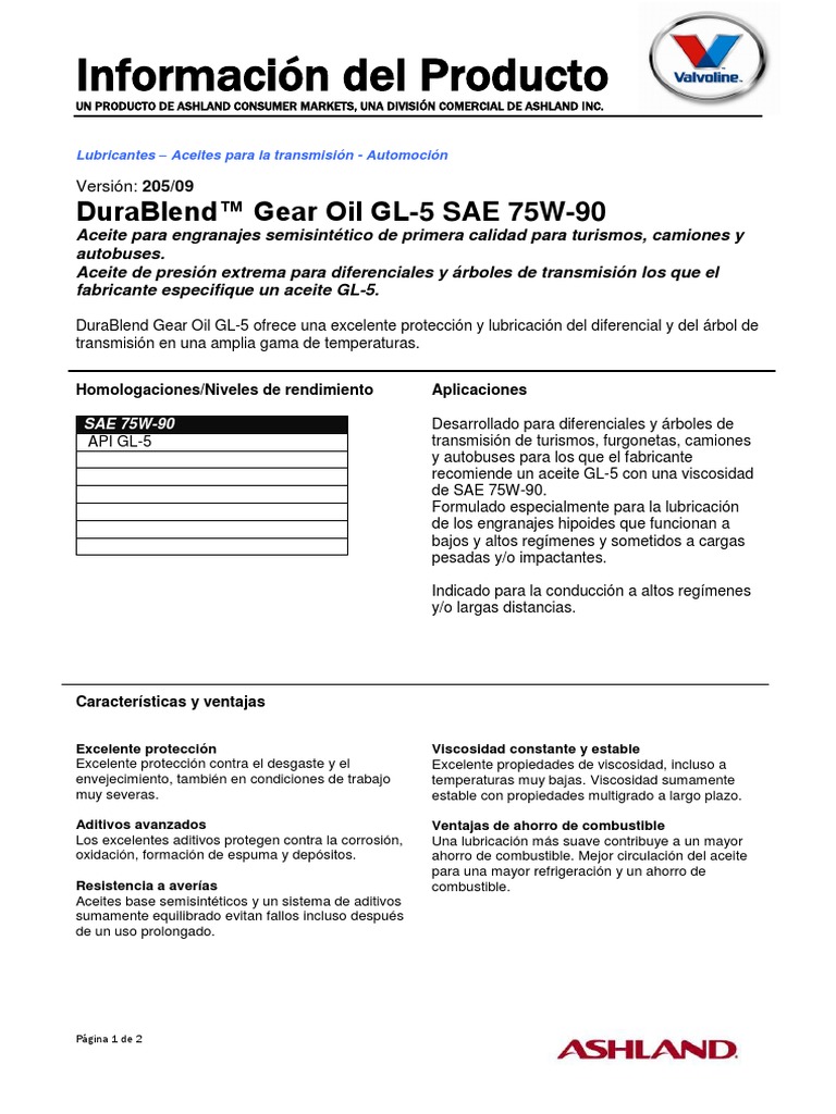 DuraBlend Gear Oil GL-5 ofrece una excelente protección y lubricación del diferencial y del árbol de