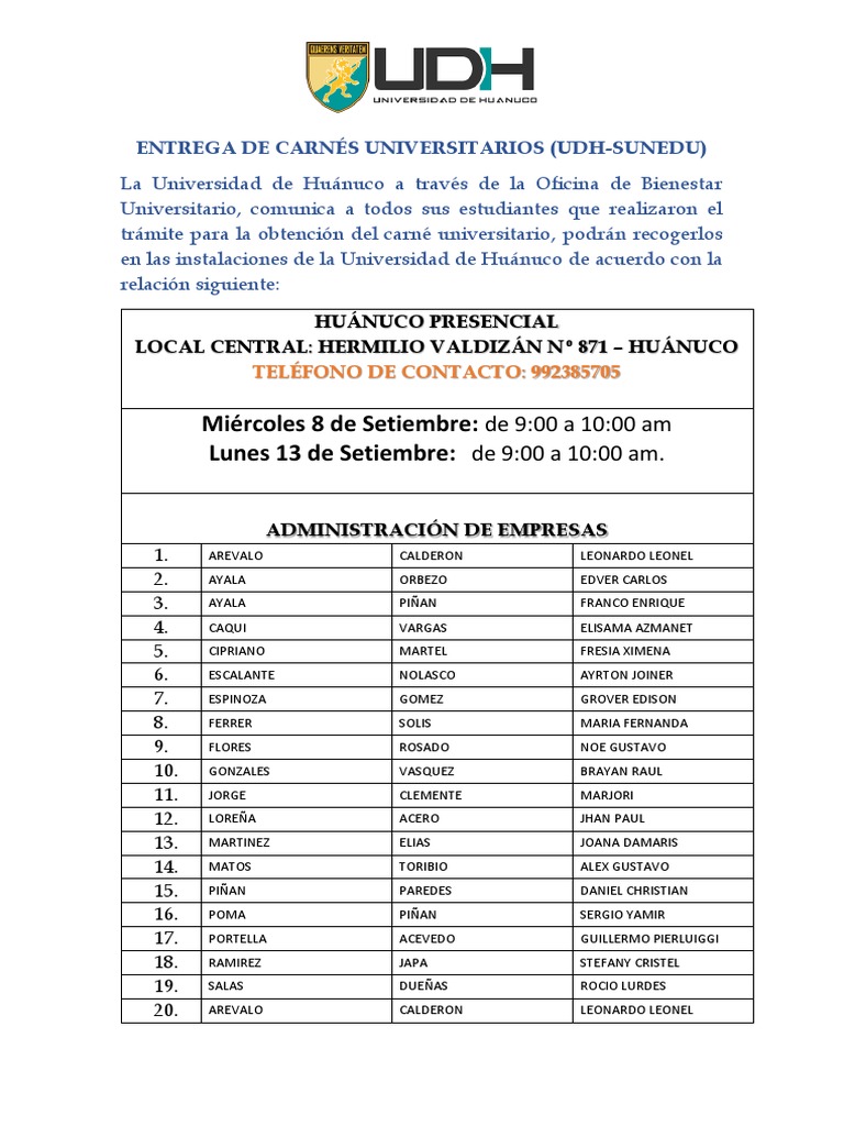 ENTREGA DE CARNÉS UNIVERSITARIOS (UDH-SUNEDU)