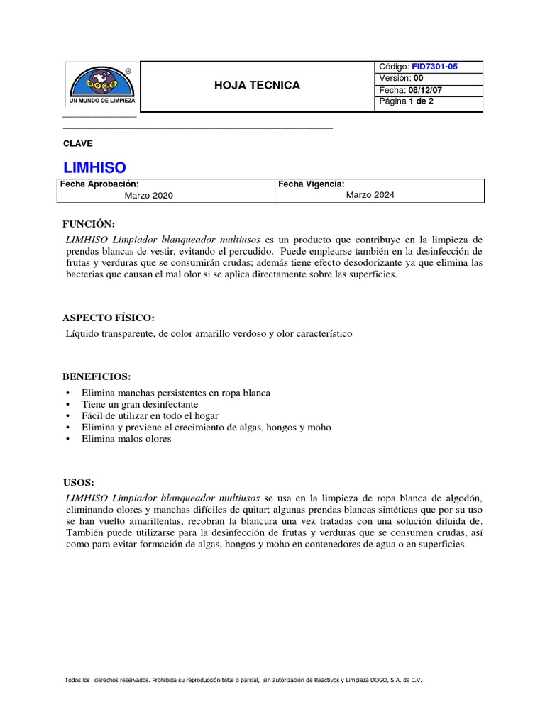 Todos los derechos reservados. Prohibida su reproducción total o parcial, sin autorización de Reactivos y Limpieza DOGO, S.A. de C.V.