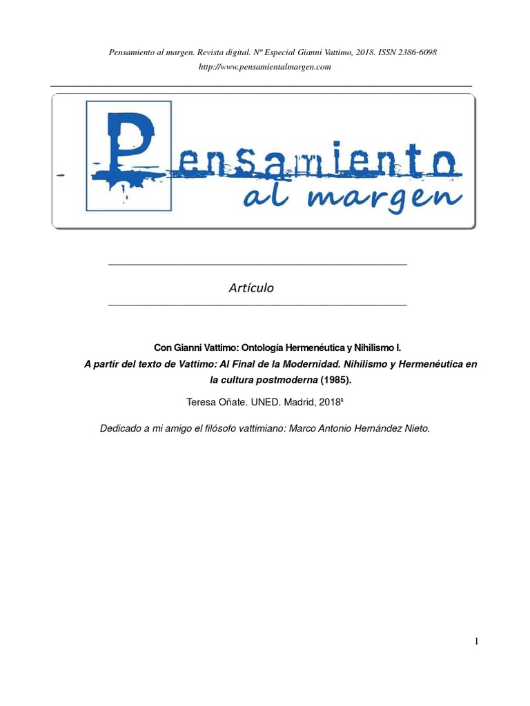 Pensamiento al margen. Revista digital. Nº Especial Gianni Vattimo, 2018. ISSN 2386-6098