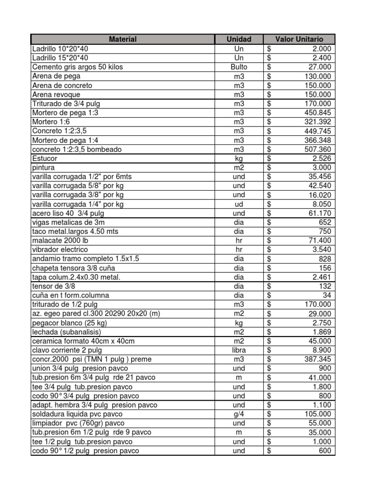 Material Unidad Valor Unitario