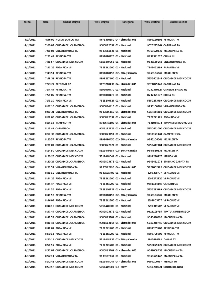 4/1/2011 [Link] CIUDAD DEL CARMEN CA 9383822031 01 - Nacional 7828251981 POZA RICA VE