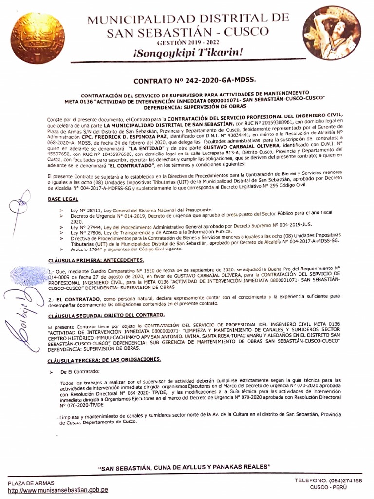una parte LA MUNICIPALIDAD DISTRITAL DE SAN SEBASTÍAN,