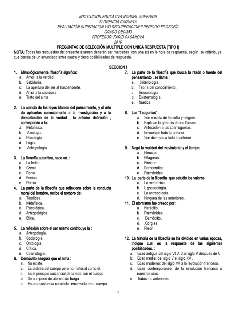 EVALUACIÓN SUPERACION Y/O RECUPERACION II PERIODO FILOSOFÍA