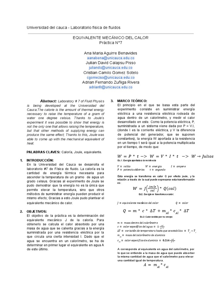 able to come up with the mechanical equivalent of constantes), la energía W aportada a la resistencia