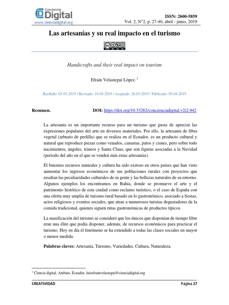 Velasteguí López, E. (2019). Las artesanías y su real impacto en el turismo.