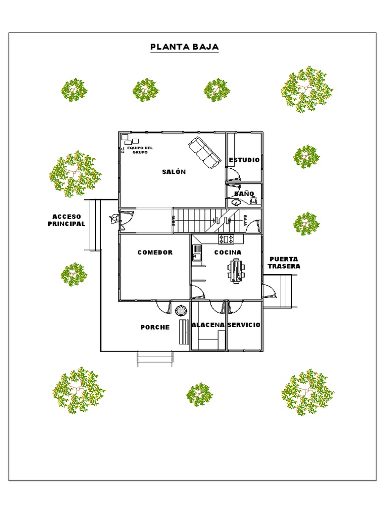 El documento presenta un plano de la planta baja de una casa, mostrando las diferentes habitaciones y áreas, incluyendo el estudio, salón, comedor, cocina, baño, acceso principal, porche y alacena de servicio.